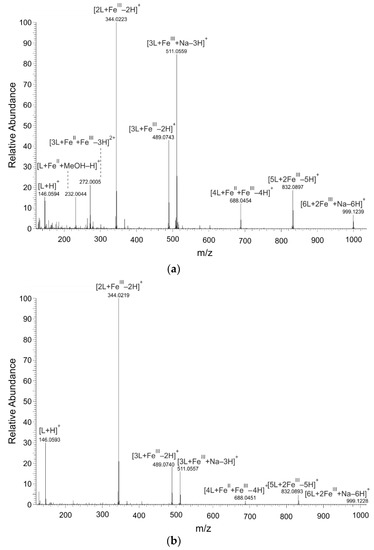 Mass spectra of Fe−8HQ (L) coordination complexes detected in solutions by nano-ESI−MS (nano-electrospray−mass spectrometry); positive ionization mode. The solutions were prepared by mixing of 8-hydroxyquinoline (8HQ) solution with (a) FeII or (b) FeIII solutions in molar ratio of metal to ligand of 1:2.