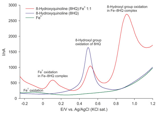 The differential pulse voltammogram of 8HQ showed one prominent peak at 482 mV (Figure 2). The shape of this peak indicated a complicated electrochemical oxidation process of the 8-hydroxyl group that is probably followed by further chemical reactions as proposed by Stevic et al. [21]. After the addition of iron (II) solution, the current of this peak decreased (Figure 2). Furthermore, its potential shifted to the anodic direction (518 mV). Moreover, two other peaks at 108 and 913 mV were visible on the voltammogram. By contrast, iron (II) solution showed only one broad peak at −74 mV of low current.