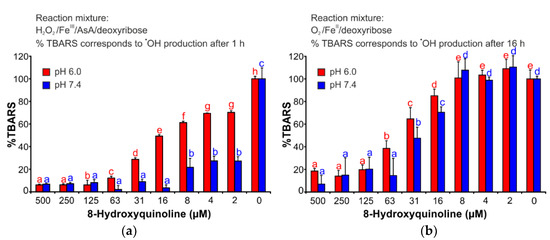 This assay explores the capability of various substances to inhibit the degradation of 2-deoxyribose by hydroxyl radicals, which are generated by the iron-catalyzed Fenton reaction [17]. Figure 3a (Table S1) shows that the antioxidant activity of 8HQ depended strongly on the pH of the reaction solution. 8HQ was a more efficient antioxidant at pH 7.4 than at pH 6.0. Nevertheless, 8HQ demonstrated an apparent ability to inhibit the oxidative degradation of 2-deoxyribose by hydroxyl radical.