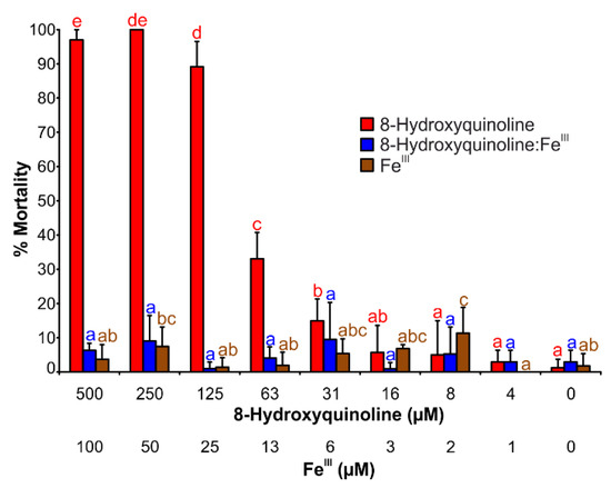 After 24 h, the wells were scored visually for dead animals (larvae without any movement for at least 10 s) by using a stereomicroscope. Fifty µL of 0.1 M HCl were used to kill all animals. In a second scoring survey, all animals were counted for each well to calculate the number of surviving larvae for each concentration tested, as required for a quantal biological assay. The negative control was the buffered saline solution without the test compound. One set of experiments was performed with 8HQ without the addition of iron (III) chloride ions and another experimental set was carried out in solutions of iron (III) chloride without the addition of 8HQ.