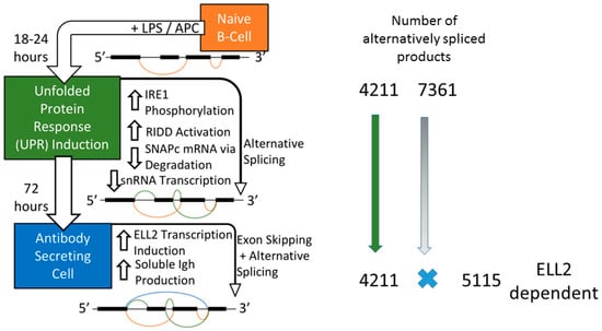 After 24 h, the activated B cell is induced to make the transcription factors Prdm1, Iref4, and ELL2, a transcription elongation factor; the cell begins a large-scale shift to produce structural changes to become an antibody-producing and -secreting factory [10,17,48]. The metabolism in antibody-secreting cells shifts to oxidative phosphorylation utilizing NADH and mitochondria to a larger extent than in naïve B cells [15]. By comparing ELL2 sufficient and conditionally ELL2 deficient mice for the spliced products that result 72 h after LPS stimulation, we found that ELL2 alters global splicing patterns in ASCs; see Figure 2. Having ELL2 present accounts for the splicing changes seen in ~55% of the genes in a comparison of cells plus and minus ELL2 [48] (Figure 2).