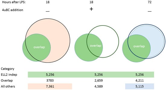 Venn diagrams of alternatively spliced genes. Left side: ELL2 independent genes (in green and seen at 72 h) overlap with the other alternatively spliced genes at 18h in orange. Middle: Addition of 4u8C changes the splicing patterns at 18 h both reducing the number and omitting some of the ELL2 independent species. Right side: Overlap between alternatively spliced genes in the ELL2+/+ and the ELL2−/− data sets at 72 h post LPS treatment. The data associated with these diagrams are deposited in NCBI Gene Expression Omnibus under accession numbers GSE113317, GSE113475 and GSE114435.