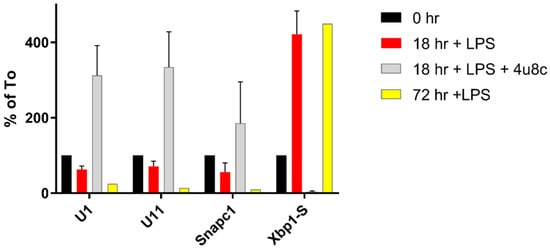 We wondered what might be causing the changes in RNA processing we had observed at 18–24 h and focused our thinking on the ER response and the UPR in the cells. We examined the levels of the small nuclear RNAs (snRNAs) in B cells after LPS stimulation and saw that they fell slightly at 18–24 h post-LPS induction and fell even further at 72 h post-LPS induction, reported in [48] and summarized here in Figure 3. Next, we examined the levels of the mRNA encoding some of the transcription factors known to be important in snRNA synthesis. The transcription of snRNAs requires cooperative binding of five SnapC subunit proteins with Oct1 (and/or Oct2) to the octamer sequence for each of the snRNA enhancers [54,55]. A little elongation complex including Ice1 and Zc3h8 with ELL1 forms and travels with RNAPII to synthesize the snRNAs [56]. The Integrator (Ints) complex of at least five proteins is necessary for snRNA transcription termination.