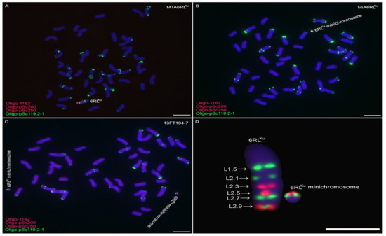 Some seeds that were derived from line 14T154-35 with two 6RLKu minichromosomes were exposed to 60Co-γ rays. A total of 1428 M1 seeds were analyzed using ND-FISH, and ten wheat-rye 6D/6RLKu small segment translocation lines were detected and named 16T379 or 16T380 (Table 1, Figure 2). In these 6D/6RLKu small segment translocation lines, the 6RLKu minichromosome divided into two smaller segments. One small segment, with the Oligo-pSc200 and Oligo-pSc250 signals and a strong Oligo-pSc119.2-1 signal, was named 6RLKumi119. The other small segment, with the Oligo-pSc200 and Oligo-pSc250 signals and a weak Oligo-pSc119.2-1 signal, was named 6RLKumi200. The segment 6RLKumi200 had been translocated onto the 6DS arm, while the segment 6RLKumi119 was translocated onto the 6DL arm (Figure 2). The small segment translocation chromosome fused with 6DS was named 6DS/6RLKumi200, and the other translocation attached with 6DL was named 6DL/6RLKumi119 (Figure 2).