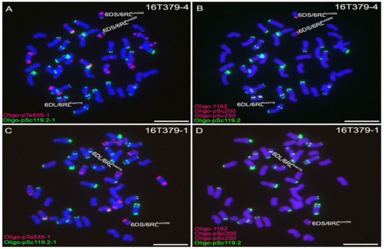 Oligo-pTa535-1 (red), Oligo-pSc119.2-1 (green), Oligo-1162 (red), Oligo-pSc200 (red), and Oligo-pSc250 (red) were used as probes for ND-FISH analysis of wheat-rye 6D/6RLKu small segment translocation lines. (A,B) Line 16T379-4 represents lines with two 6DS/6RLKumi200 and two 6DL/6RLKumi119 chromosomes. (A) and (B) are the same cell. (C,D) Line 16T379-1 represents lines with one 6DS/6RLKumi200 and one 6DL/6RLKumi119 chromosome. (C) and (D) are the same cell. Chromosomes were counterstained with DAPI (blue). Scale bar 10 μm.