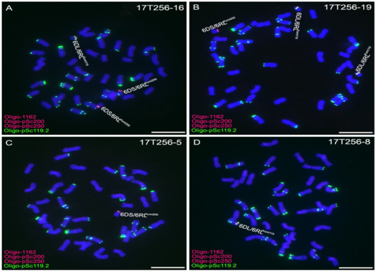 Among 100 randomly selected seeds from the progeny of 16T379-1, 21 derived seedlings contained no translocation chromosomes, 16 seedlings contained two 6DS/6RLKumi200 and two 6DL/6RLKumi119 chromosomes, 42 seedlings contained one 6DS/6RLKumi200 and one 6DL/6RLKumi119 chromosome, eight contained two 6DS/6RLKumi200 and one 6DL/6RLKumi119 chromosome (Figure 3A), three plants contained one 6DS/6RLKumi200 and two 6DL/6RLKumi119 chromosomes (Figure 3B), three plants contained only one 6DS/6RLKumi200 chromosome (Figure 3C), and seven plants contained only one 6DL/6RLKumi119 chromosome (Figure 3D). The progeny of 16T379-1 were named 17T256, and some of these plants were used for further marker development. All of the randomly selected 100 seeds from the progeny of 16T379-4 contained two 6DS/6RLKumi200 and two 6DL/6RLKumi119 chromosomes. These results indicate that the 6DS/6RLKumi200 and 6DL/6RLKumi119 chromosomes show a high frequency of transmission to progeny.