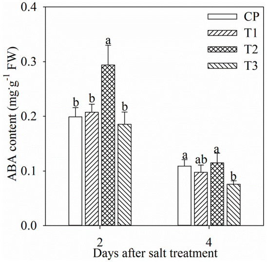 Changes in root abscisic acid (ABA) content in Jerusalem artichoke after salt stress for two days (a) and four days (b). Data in the figure indicate mean of five replicates (±SD), and different letters on error bars indicate significant difference at p < 0.05. CP indicates control plants without pretreatment and NaCl stress; T1 indicates tungstate-pretreated plants without NaCl stress; T2 indicates non-pretreated plants under 150 mM NaCl stress; T3 indicates tungstate-pretreated plants under 150 mM NaCl stress. The symbols, CP, T1, T2, and T3 are also used in the following figures.
