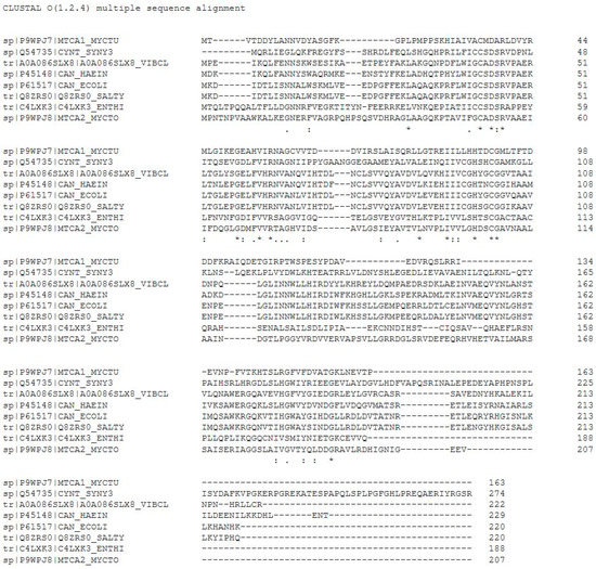 Multi-alignment of the amino acid sequences of the β-CAs from M. tuberculosis (isoform MTCA1_MYCTU), Synechocystis sp. (SYNY3), V. cholerae (VIBCL), H. influenzae (HAEIN), E. coli (ECOLI), S. typhimurium (SALTY), E. histolytica (ENTHI), and M. tuberculosis (isoform MTCA2_MYCTO) [21,30,31,32,33,34,35,36]. Conserved amino acids depicted by an asterisk (*), semiconserved ones by (.) or (:).