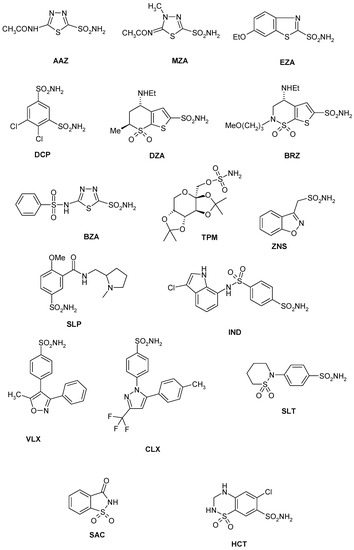 Considering that the sulfonamides are the main class of CA inhibitors (CAIs) [11,12,13], we investigated the inhibition of EhiCA with a panel of such derivatives, some of which are clinically used drugs like diuretics, antiglaucoma, antiepileptics, antiobesity or antitumor agents [37,38,39,40] (Figure 2 and Table 2). The structures of the sulphonamides/sulfamates included in our study are shown in Figure 2. They include acetazolamide AAZ, methazolamide MZA, ethoxzolamide EZA and dichlorophenamide DCP (the classical, systemically acting antiglaucoma CA inhibitors) [11,12], dorzolamide DZA and brinzolamide BRZ, topically-acting antiglaucoma drugs, benzolamide BZA, topiramate TPM, zonisamide ZNS, and sulthiame SLT [11,12,13,37,38,39,40]. Sulpiride SLP, indisulam IND, celecoxib CLX, and valdecoxib VLX, as well as saccharin and the diuretic hydrochlorothiazide HCT were also included in the assay [11,12,13]. The simpler sulfonamides 1–24 are known to possess CA inhibitory properties against many mammalian and prokaryotic such enzymes [25] and are also the building blocks for obtaining more complex CAIs [41,42,43].