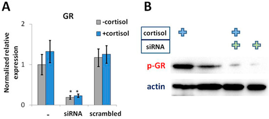 Treatment with cortisol for 24 h did not affect the level of GR mRNA in NCIH-196 cells (Figure 2A) while GR phosphorylation that is required for the translocation of activated GR–steroid complex into the nucleus [48] was significantly induced (Figure 2B). Administration of specific siRNA led to a significant decrease in both GR mRNA and phosphorylated GR (p-GR), regardless of experimental conditions (Figure 2A,B).
