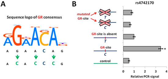 2.2. The rs4742170 (T) Allele in IL33 Enhancer Disrupts GR-Binding Site