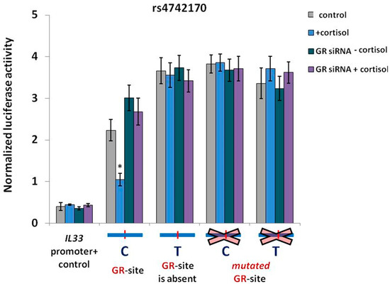 In order to identify the role of GR in regulation of the IL33 promoter activity, we used reporter vectors containing the IL33 promoter and an enhancer bearing one of the rs4742170 versions tested in the DNA binding experiments. We performed luciferase reporter assays under normal conditions, in the context of cortisol-induced stimulation or upon siRNA-mediated GR suppression. Cortisol-mediated GR induction affected the IL33 promoter activity only in the presence of the enhancer element carrying the functional GR-binding site (Figure 4). The risk 4742170 (T) allele in IL33 enhancer, as well as point mutations of the GR-binding site, increased the basal activity of the reporter constructs and made them completely unresponsive to cortisol. At the same time, the activity of the IL33 promoter construct containing the common rs4742170 (C) allele with functional GR-binding site was lower and went further down upon cortisol treatment. The effect of the cortisol-induced GR stimulation with subsequent suppression of IL33 promoter activity was abolished by the addition of GR-specific siRNA. These results suggest the negative role of the risk rs4742170 (T) allele in asthma may be mechanistically related to the increased IL33 promoter activity, due to reduced binding of the GR transcription factor.