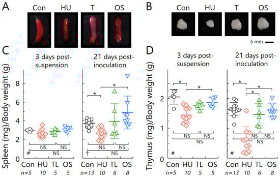 Lymphoid organ atrophy in the four suspension conditions was measured at 3 days after suspension and at 21 days after tumor cell inoculation. (A,B) Representative photographs at 21 days after tumor cell inoculation. (C,D) Organ weight relative to body weight. (A,C) Spleen. (B,D) Thymus. Circles, standard housing control group (Con); diamonds, hind-limb unloading (HU); triangles, temporary loading during HU (2 h per day) (TL); inverted triangles, orthostatic suspension (OS). Error bars indicate standard errors. #, ANOVA test; †, Kruskal-Wallis test. * p < 0.05; NS, not significant.