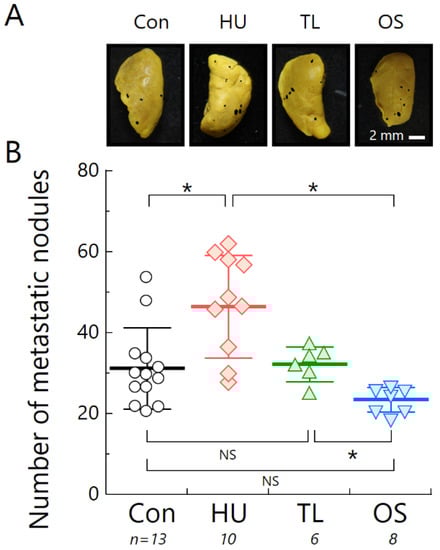 A schematic of the work flow for experiments is shown in Figure 5. The mice were divided into four groups—Con, HU, TL, and OS. LM8 cells (2 × 106 cells in 50 μL culture medium without FBS, administered by subcutaneous injection) were inoculated into the lower right abdominal region on day 3 after tail suspension. We measured tumor size regularly throughout the experiment, and quantified the number of lung metastatic nodules at 21 days post-inoculation. To assess whether the spleen and thymus were diminished at 3 days after tail suspension (n = total 25) and at 21 days after LM8 inoculation (n = total 37), the spleens and thymi were weighed.