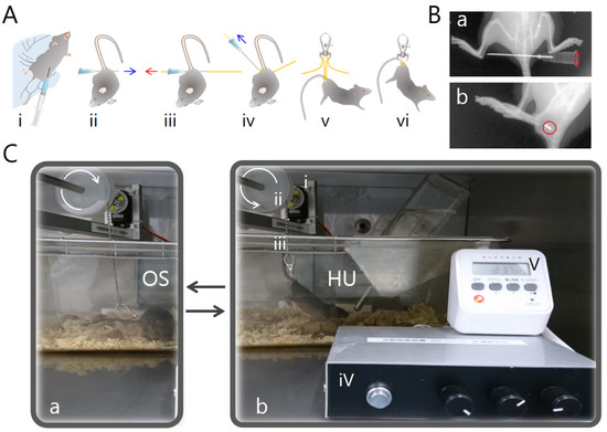 Tail suspension. (A) Method of tail suspension. (i) Mice were anesthetized by intraperitoneal injection of 37 mg/kg ketamine and 7.4 mg/kg xylazine in 250 μL saline. (ii) A needle was placed into the sacrum coccyx joint of the mouse, (iii) threaded, and (iv) removed, leaving the thread in place. (v) The nylon thread was fed through a rotary hook, and (vi) tied in place to suspend the hind limbs of the animal. (B) Transmission image at needle puncture site using a Kodak IS4000 IN-VIVO FX (Carestream Health Inv., Rochester, NY). (a) Top view; (b) view from the side. Red circle, needle base. (C) An electric suspension device with a digital power supply timer. (a) Orthostatic suspension (OS). (b) Hind-limb unloading (HU). (i) motor; (ii) fixed pulley; (iii) rope; (iv) controller; and (v) digital power supply timer.
