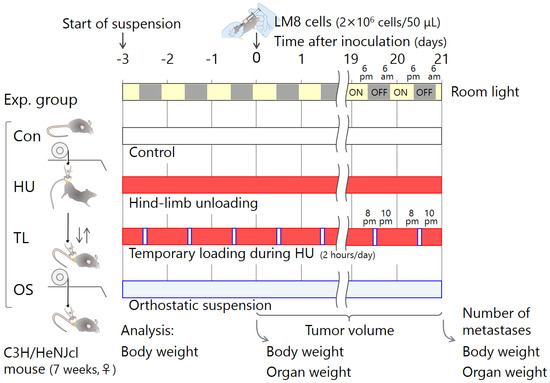 Schematic work flow for experiments. LM8 cells, a murine osteosarcoma line, were inoculated subcutaneously in C3H/HeNJcl mice 3 days after tail suspension under four conditions: Con, standard housing control; HU, hind-limb unloading; TL, temporary loading during HU (2 h per day); and OS, orthostatic suspension.