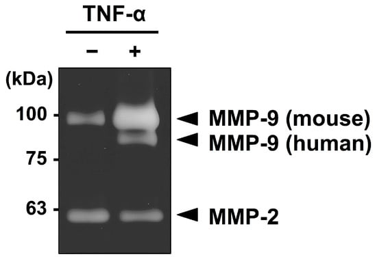 Zymographic analysis of MMPs in the conditioned medium of the co-culture of MKN1 and mesothelial cells after TNF-α treatment. A suspension of MKN1 cells (5 × 104 cells/0.2 mL) in ASF104 medium was added to a monolayer of murine peritoneal mesothelial cells in a 96-well culture plate and the cells were cultured with/without TNF-α (10 ng/mL) for 48 h. The culture supernatant was analyzed by gelatin zymography.