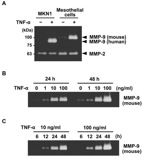 We first examined the effects of TNF-α on MMP-9 secretion in the co-cultures of MKN1 and peritoneal mesothelial cells. Zymographic analysis of the conditioned medium of the co-culture of these cells revealed that MMP-9 secretions from both MKN1 and murine peritoneal mesothelial cells were markedly increased in the presence of TNF-α (10 ng/mL) (Figure 1). Since murine MMP-9 has a slightly higher molecular mass (105 kDa for proMMP-9) than its human counterpart (92 kDa) due to the presence of an extra amino acid sequence in murine MMP-9 [], the two molecules can be distinguished from each other by zymography. By contrast, the MMP-2 level was not significantly changed in the conditioned medium after TNF-α treatment. The upregulation of MMP-9 secretion from both types of cells by TNF-α treatment (10 ng/mL) was confirmed when TNF-α was added to the separate cultures of MKN1 and mesothelial cells (Figure 2A). We observed low-level secretion of MMP-2 from both cell types in the absence of TNF-α, and the secretion was not substantially influenced by TNF-α treatment in either case. We then examined the dose-response of the potentiation of MMP-9 secretion by TNF-α. In the zymographic analysis, we detected MMP-9 activity in the conditioned medium of mesothelial cell culture in the presence of TNF-α (1 ng/mL) for 24 or 48 h, and the MMP-9 secretion was dose-dependently increased (up to 100 ng/mL) (Figure 2B). In the kinetic analysis, we detected MMP-9 activity after the culture with TNF-α for 12 h, and MMP-9 secretion was increased at 24 and 48 h (Figure 2C). These results clearly indicated that TNF-α treatment induced MMP-9 secretion from mesothelial cells, in addition to enhancing MMP-9 secretion from MKN1 gastric carcinoma cells.