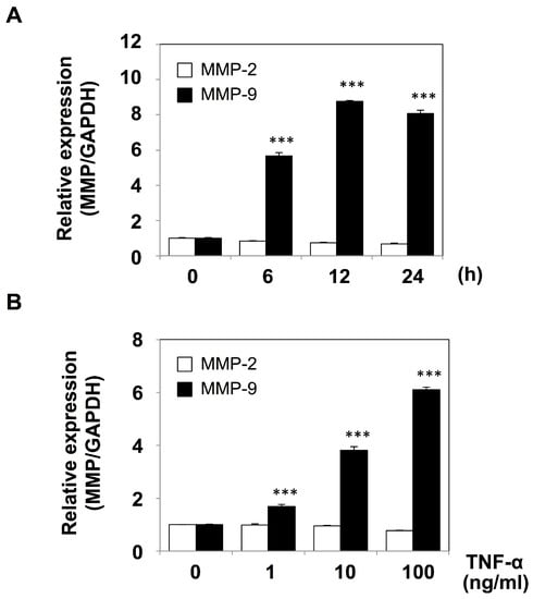 RT-qPCR analysis of mRNA for MMP-2 and MMP-9 in mesothelial cells after treatment with TNF-α. (A) Mesothelial cells were cultured in ASF104 serum-free medium containing TNF-α (10 ng/mL) at 37 °C for 0, 6, 12 or 24 h. Total RNA was then isolated, and RT-qPCR for the genes for MMP-2 (open bar) and MMP-9 (closed bar) was carried out as described in Section 4. (B) Mesothelial cells were cultured in ASF104 medium containing TNF-α (0, 1, 10 or 100 ng/mL) for 6 h. The gene expressions of MMP-2 (open bar) and MMP-9 (closed bar) were analyzed by the relative standard curve method using Gapdh as an internal control. Experiments were performed in triplicate, and the data are presented as the mean ± SEM. Statistical data analysis was conducted using the Student’s t-test. *** p < 0.005 vs. control.
