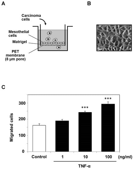 Cell invasion assay using a reconstituted artificial mesothelium in a Boyden chamber (Transwell) system. (A) The inner chamber with a membrane (8.0 μm pore) was composed of a monolayer of peritoneal mesothelial cells on a Matrigel layer and was utilized to examine the migration of MKN1 cells. The outer chamber was filled with ASF104 medium supplemented with HT1080 serum-free conditioned medium as a chemoattractant. (B) Microscopic observation of a monolayer of mesothelial cells (scale bar = 20 μm). (C) After mesothelial cells were treated with TNF-α (1, 10 or 100 ng/mL) and washed with ASF104 medium, MKN1 cells (1 × 105 cells/0.2 mL) were placed in the inner chamber and incubated at 37 °C for 16 h. The cells migrating into the outer chamber through the membrane were counted under a microscope after staining with Diff-Quik. Experiments were performed in triplicate, and the data are presented as the mean ± SEM. Statistical data analysis was conducted using the Student’s t-test. *** p < 0.005 vs. the control.