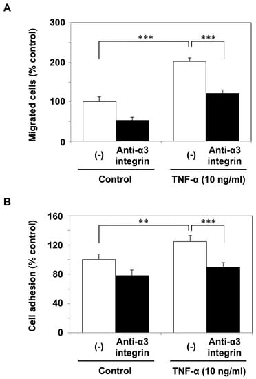 We previously found that the interaction between α3β1 integrin on cancer cells and laminin in the mesothelium played an important role in the cancer cell adhesion and invasion [,]. Next, we examined the effects of the anti-α3 integrin antibody on the transmigration of MKN1 cells through the reconstituted mesothelium. The cell invasion potentiated by TNF-α was significantly inhibited by the anti-α3 integrin antibody (Figure 5A), suggesting the importance of an α3β1 integrin-dependent process in the invasion. The adhesion of MKN1 cells to a monolayer of mesothelial cells was also increased after the TNF-α treatment of mesothelial cells and was partially inhibited by the anti-α3 integrin antibody (Figure 5B). Mochizuki et al. [] reported that the treatment of mesothelial cells with TNF-α induced their morphological change followed by an increase in the areas of intercellular gaps. This process may cause exposure of the submesothelial extracellular matrix (ECM) in the intercellular gaps. Because laminin-332, a counter-ligand for α3β1 integrin, is a major component of submesothelial ECM, TNF-α treatment might facilitate the adhesion of MKN1 cells to the mesothelium via α3β1 integrin/laminin-332 interaction. In RT-qPCR analysis, we observed a slight increase in expression of the γ2 subunit of laminin-332 after TNF-α treatment of mesothelial cells (Figure S1), and this might also have caused the increased adhesion of MKN1 cells.