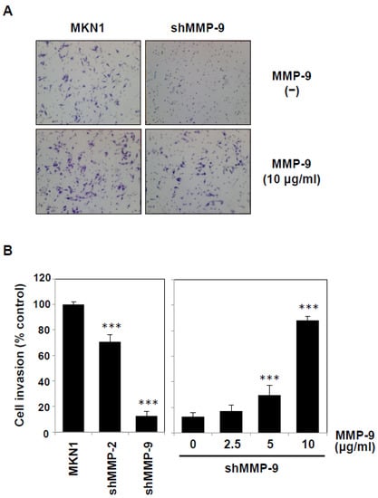 Potentiation of the invasion of MMP-9-knockdown MKN1 cells by exogenous MMP-9. MMP-2- or MMP-9-knockdown MKN1 cells were prepared by RNA interference as described in the Materials and Methods section. (A) The MMP-9-knockdown MKN1 cells (right) and parent cells (left) were assayed for in vitro invasion using Matrigel basement membranes in the presence or absence of MMP-9 purified from THP-1 cells. After culturing for 16 h, the cells that had migrated into the lower chamber were microscopically observed (40×). (B) MMP-2- or MMP-9-knockdown MKN1 cells were subjected to an invasion assay, and the migrated cells were counted under a microscope (Left). The invasion assay was performed in the presence of purified MMP-9 (2.5–10 μg/mL) (right). Experiments were performed in triplicate, and the data are presented as the mean ± SEM. Statistical data analysis was conducted using the Student’s t-test. *** p < 0.005.