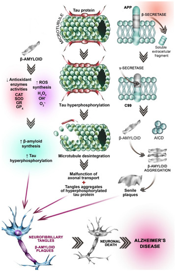 Several theories have endeavored to explain the development of AD-related pathomorphological changes in the brain, such as the cholinergic hypothesis (including altered glutamatergic transmission), amyloid aggregation theory, tau protein theory, and oxidative stress theory, of which amyloid β aggregation and tau hyperphosphorylation are currently considered to play the most crucial roles [4].