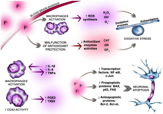 The pro-oxidative and pro-inflammatory effect of fluoride exposure on the brain. Fluoride ions easily cross the blood–brain barrier (dark gray arrow, pink highlight). Within the brain fluoride influences normal metabolism of the neurons and glial cells. The fluoride effect on the nervous system is complex and varied. Fluoride is well documented pro-oxidative factor. Promotes oxidative stress. It enhances reactive oxygen species ROS (H2O2, OH−, and O2•−) synthesis by activated macrophages (violet highlight). F− weakens the antioxidants’ function by inhibiting the actions of antioxidant enzymes superoxide dismutase (SOD), catalase (CAT), glutathione peroxidase (GPx), and glutathione reductase (GR) (light red highlight). Excessive ROS production and simultaneous impaired antioxidative enzymes’ action leads to the oxidative stress (OS). OS is an imbalance between oxidation and antioxidation processes (blue balance beam). F− enhances the neuroinflammation in the brain. Fluoride dependent stimulation of the pro-inflammatory cytokines synthesis (IL-6, TNF-α, and IFN-γ) is a key step in the inflammation process development. In physiological conditions low concentration of IL-6 in the brain is observed (violet arrows, violet highlight). The increase in the IL-6 is noticed in the inflammation or neurodegenerative diseases. Excessive production of IL-1β and TNF-α is observed in neuroinflammation and neurodegenerative diseases. Overproduction of cytokines in response to fluoride exposition results in inflammation development and neurodegeneration. Fluoride exposition, i.e., due to the inflammatory cytokines increase, leads to the increased activity of the enzymes involved in inflammation (i.e., COX-2) and subsequent production of prostanoids: prostaglandin E2 (PGE2) and thromboxane A2 (TXB2) (violet arrow, violet highlight). F− in the brain increases apoptosis rate by activating the transcription factors (NF-κB, c-JUN) and proapoptotic proteins BAX, FAS, and p53. Simultaneously F- inhibits antiapoptotic proteins synthesis BCL2, BCL-XL (pink highlight, dark gray arrows).