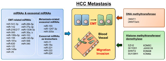 Thus, in this review, we introduce HCC-related epigenetic modifiers (miRNA, DNA methyltransferases/demethylases, and histone methyltransferases/demethylases) and suggest their clinical utility in HCC treatment. In particular, we summarize the molecular mechanisms and functions of epigenetic modifiers in HCC metastasis, suggesting their potential as therapeutic targets and diagnostic markers in HCC.