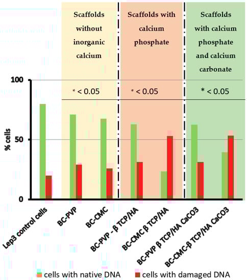 Noteworthy, the results from the FACS analysis for discrimination between apoptosis and necrosis are in correspondence with the results from the alkaline Comet Assay. The detected genotoxic potential of BC-CMC-β-TCP/HA and BC-CMC-β-TCP/HA-CaCO3 is also reflected in the experiments for studying of the mechanisms for the induction of different types of cell death. In the cases when cells were cultivated in the presence of these types of scaffolds (i.e., BC-CMC-β-TCP/HA and BC-CMC-β-TCP/HA-CaCO3), the higher levels of apoptosis were seen. It could be a result from the possible genotoxic effect of these substances/scaffolds.