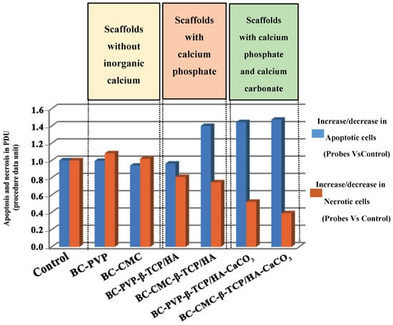 In order to elucidate the mechanisms of the biological action of the tested scaffolds on the studied cellular model systems and to understand the reasons for the detected genotoxic potential of those with calcium phosphate and carbonate functionalization, i.e., BC-CMC-β-TCP/HA and BC-CMC-β-TCP/HA-CaCO3 (already detected with the Comet Assay Figure 2), FACS analysis (fluorescence activated cell sorting) with Annexin V-FITC kit performed for evaluation of the percentage of cells undergoing apoptosis and necrosis when layered onto all studied scaffolds. The percentage of apoptotic and necrotic cells together with the percentage of live cells was estimated by software data quantitation. Further on the ratio among cells in apoptosis and necrosis and alive cells was done and is displayed in procedure data values (PDU) on Figure 3. The last represents the ratio between apoptotic and necrotic cells in the probes versus these percentages in the controls (Lep-3 control cells). The blue bars on Figure 3 represent the ratio between the percentages of apoptotic cells in the probes versus the control, while the red bars represent the ratio between the percentages of necrotic cells in the tested probes versus the necrotic cells in the control. As it is easily seen on Figure 3 an increased number (around 40%) of apoptotic cells was detected in the probes of human Lep-3 cells grown in 3 days’ extract culture medium in presence of BC-CMC-β-TCP/HA, BC-PVP-β-TCP/HA-CaCO3 and BC-CMC-β-TCP/HA-CaCO3. Interestingly, the trend with the observed increase of apoptosis between BC-PVP and BC-PVP-β-TCP/HA was similar but when compared to BC-CMC-β-TCP/HA, BC-PVP-β-TCP/HA-CaCO3 and BC-CMC-β-TCP/HA-CaCO3 it was not so-well pronounced as previously expected.