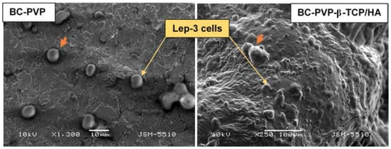 The SEM analysis of hydrogel scaffolds-Lep-3 cell interaction is depicted in Figure 4. The analysis was performed with BC-PVP and BC-PVP-β-TCP/HA, as these materials showed better cyto-compatibility in direct (DE) and indirect experiments (IDE). The presence of Lep-3 cells including groups of 2–3 cells was observed on the surface of both materials (Figure 4). The adhered Lep-3 cells on the surface of BC-PVP-β-TCP/HA can be seen notably.