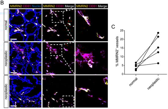 Multimerin-2 expression is lost in a number of gastric cancer-associated vessels. (A) Representative images of normal gastric mucosa samples stained with anti-Multimerin-2 (yellow) and anti-CD31 (magenta) antibodies. Nuclei were stained with TO-PRO® 3 (blue). Scale bar = 30 μm. (B) Representative images showing the colocalization of Multimerin-2 and CD31 in normal gastric mucosa and in gastric cancer samples. Staining were performed as in A. Scale bar = 50 μm. Magnifications (2.7×) are shown in the panels on the right. (C) Graph representing the percentage of blood vessels displaying no staining for Multimerin-2 (MMRN2−) in normal and neoplastic samples of 5 patients evaluated by IF as in B.