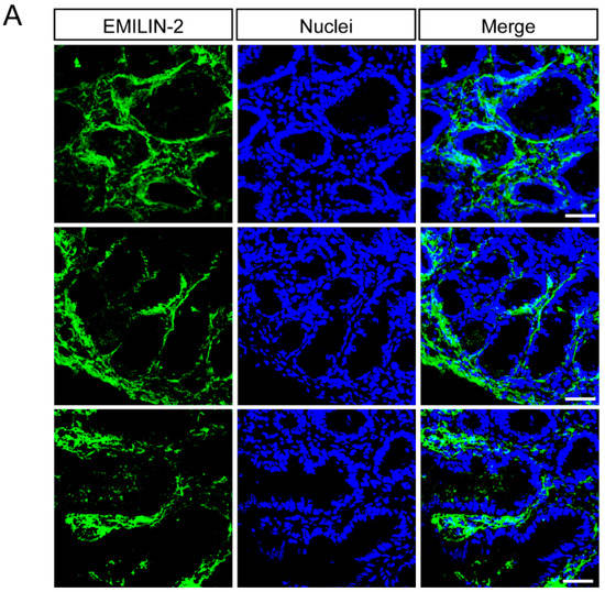 2.3. EMILIN-1 and EMILIN-2 Are Co-Expressed in the Gastric Lamina Propria