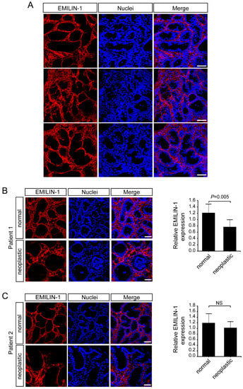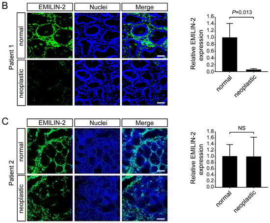 EMILIN-2 expression is decreased in some gastric cancer patients. (A) Representative images of normal gastric mucosa samples stained with anti-EMILIN-2 (green). Nuclei were stained with TO-PRO® 3 (blue). Scale bar = 50 μm. (B) Images and quantification of the expression of EMILIN-2 (green) in normal and in gastric cancer samples from Patient 1. Nuclei were stained with TO-PRO® 3 (blue). Scale bar = 50 μm. (C) Representative images and quantification of the expression of EMILIN-2 (green) in normal and in gastric cancer samples from Patient 2. Nuclei were stained with TO-PRO® 3 (blue). Scale bar = 50 μm. Graphs represent the mean ± SD; p values were obtained using the paired Student’s t-test. NS: not significant.