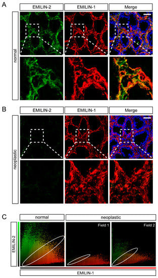 Next, we analyzed the expression of EMILIN-1. Also in this case, for the first time we show a high deposition of this molecule in the lamina propria (Figure 4A). These analyses indicated that EMILIN-1 levels did not change considerably in the tumor samples (Figure 4B), despite the organization of the molecule was altered in some samples (Figure 4C). Indeed, only one patient with a T1b stage displayed lower EMILIN-1 levels in the tumor compared to the adjacent normal mucosa, whereas EMILIN-1 expression did not change in patients with a T3 stage grading (Figure 4B,C and data not shown). These results were partially in line with recent data showing that EMILIN-1 was expressed at a low level in T1 stage or grade 1–2 patients and at a high level in T2–4 or grade 3 patients []. Given that both EMILIN-2 and EMILIN-1 were deposited in the same district, we next simultaneously analyzed the expression of the two molecules both in normal and neoplastic gastric samples. As shown in Figure 5, the expression of EMILIN-2 and EMILIN-1 partially overlapped in normal samples, however EMILIN-1 expression was more adjacent to the epithelium of the gastric glands. Interestingly, when EMILIN-2 expression was strongly decreased in gastric tumor samples, the organization of the EMILIN-1 fibers was also altered (Figure 5B).