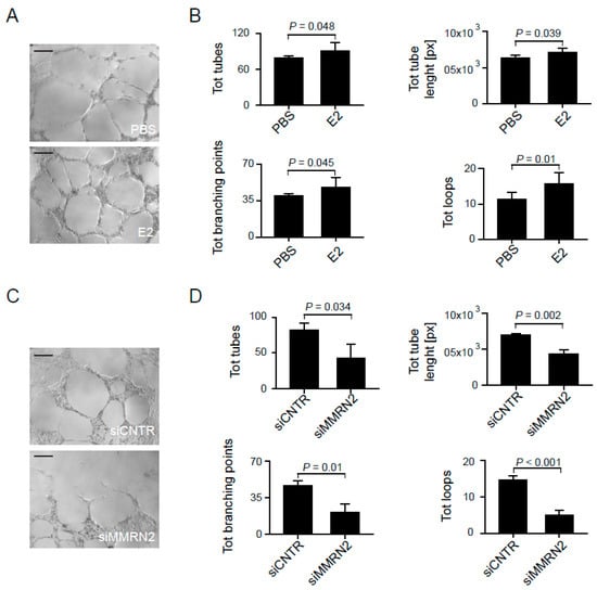 Multimerin-2 and EMILIN-2 expression impact on the angiogenic response in the gastric cancer environment. (A) Representative images of the tubes formed by HUVEC cells placed on MATRIGEL® and challenged with conditioned media from AGS cells following the addiction of recombinant EMILIN-2 (E2) or an equal volume of PBS; scale bar = 100 μm. (B) Quantification of the total of tubes, total branching points, total tubes length and total loops of the experiment reported in A; [px]: pixels. (C) Representative images of the tubes formed by HUVEC cells placed on MATRIGEL® and challenged with conditioned media from AGS following transduction with the control (siCNTR) or Multimerin-2 specific (siMMRN2) siRNA adenoviral constructs; scale bar = 100 μm. (D) Quantification of the total tubes, total branching points, total tubes length and total loops of the experiment reported in C. Graphs represent the mean ± SD; p values were obtained using the paired Student’s t-test.