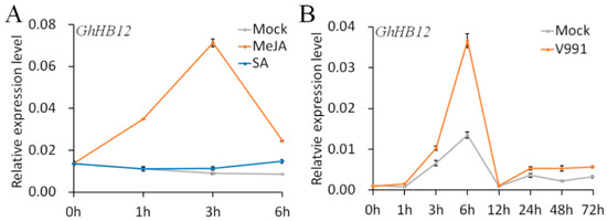 The expression patterns of GhHB12 in response to (A) methyl jasmonate (MeJA) and salicylic acid (SA) and (B) V. dahliae infection. Total RNAs were extracted from roots of ”YZ1” seedlings at the indicated time points after treatments. The GhUBQ7 gene was used as the endogenous reference gene. The data represent the mean ± SD of three technical replicates.