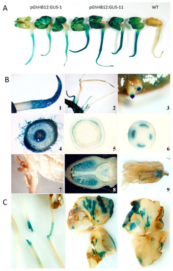 Histochemical localization of β-glucuronidase (GUS) activity in pGhHB12:GUS cotton plants. (A) GhHB12 promoter drives GUS expression in the cotyledons and primary roots of the 3-day-old seedlings. (B) GhHB12 promoter preferentially drives GUS expression in cotton primary roots, tips of lateral roots, vascular tissues, and floral organ. GUS staining in the (1) primary roots and (4) root hairs of the 3-day-old seedlings, (2,3) lateral roots of the 10-day-old seedlings, (5) section of stem, (6) petiole, (7) shoot apices and young leaves of 30-day-old plants, a longitudinal section of (8) buds and (9) flowers. (C) Wounding stress regulation of GhHB12 promoters. GUS activity was detected in the mechanically damaged hypocotyls and cotyledons of the 10-day-old seedlings.