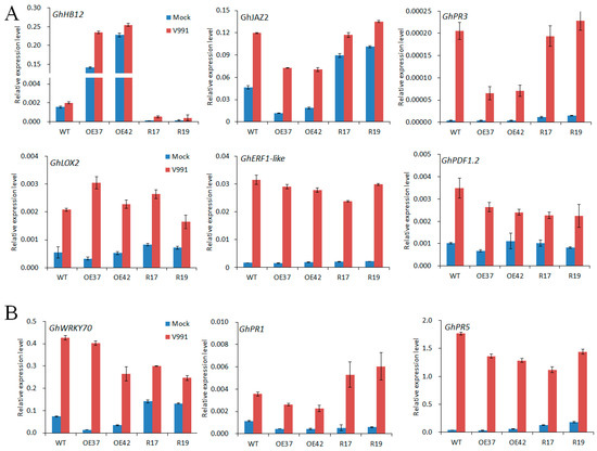 GhHB12 reduced the expression of jasmonic acid (JA)-responsive defense maker genes (GhJAZ2, GhPR3) in cotton. qRT-PCR analysis of (A) JA-responsive defense maker genes and (B) SA-responsive defense maker genes in roots of wild-type (WT) and GhHB12 transgenic cotton lines (overexpression lines: OE37 and OE42; RNAi lines: R17 and R19) after inoculation with or without V. dahliae V991. Total RNAs were extracted from roots of seedlings at the indicated time points (24 h) after 12 h inoculation. The GhUBQ7 gene was used as the endogenous reference gene. The data represent the mean ± SD of three technical replicates.