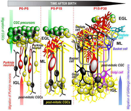 - Yamanaka, H.; Yanagawa, Y.; Obata, K. Development of stellate and basket cells and their apoptosis in mouse cerebellar cortex. Neurosci. Res. 2004, 50, 13–22. [Google Scholar] [CrossRef] [PubMed]