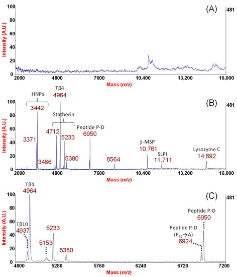 Reproducibility was assessed by measuring the coefficient of variations (CVs) for a normalized area along with height and signal-to-noise ratio (S/N) of selected peaks in acquired MALDI-TOF MS spectra from independent intra-day replicate analyses (n = 3) of the same NF sample processed by MPS. Table S1 lists CVs of AMP selected in this study for normalized peak area, peak intensities, and S/N. The CVs for the peaks of interest (Table S1) were comprised in a range from 5% to 16%, 8% to 15%, and 8% to 17%, for normalized area, height and S/N, respectively, which confirms the robustness of the method. Analytical and instrumental conditions already tested in our previous study were carefully controlled in order to ensure accurate and reproducible measurements. We also evaluated the subject-to-subject variability in the group of the eight healthy donors. The peptide profiles shared most of the peaks detected. The peak frequency for the detected peptides is reported in Table 1. Thymosin β4, SLPI, Lysozyme-C, Peptide P-D and the Statherin fragment (m/z = 4712) were present in all donors. β-MSP and the phosphorylated form of II-2 peptide were shared by seven of the eight donors and a lower frequency was observed for the other peptides such as the alpha defensins. All subject profiles are reported in Figure S1, which clearly shows the inherent biological variability among subjects. In the case of alpha defensins, the observed amount of between-individual variability could be attributed to genetic factors affecting the phenotype (gene DEFA3/1). In particular, these HNPs were observed in five of the eight donors and, specifically, HNP3 was detected in only three of the five donors with HNPs (see Table 1, Figure S1). Defensin alpha 3 differs from defensin alpha 1 by only one amino acid. The genes encoding for defensin alpha 1 and defensin alpha 3 are both subject to the copy number variation. It is important to observe that this copy number polymorphism of DEFA1/DEFA3 with a consequent frequent absence (7/27 individuals as reported in literature) of the DEFA3 allele encoding the HNP-3 peptide are believed to likely affect the function and effectiveness of innate immunity [28].