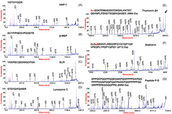 MALDI-TOF/TOF mass spectra of some relevant peptides analyzed by sequence identification directly from NF processed with the MPS or alternatively after gel electrophoresis separation of the captured proteins. The left column shows MS/MS spectra of peptides obtained from triptic digestion of (A) HNP1: YGTCIYQGR (residues 80 to 88). (B) β-MSP: SCYFIPNEGVPGDSTR (residues 21 to 36). (C) SLPI: YKKPECQSDWQCPGK (residues 46 to 60) and (D) Lysozyme C: STDYGIFQINSR (residues 69 to 80). The right column shows MS/MS spectra obtained by direct sequencing of (E) Thymosin β4 (Red letter Ac: N-terminal acetylated), (F) statherin Des39–43 (Red letter p: phosphorylated on Ser 2 and Ser 3), and (G) Peptide P-D.