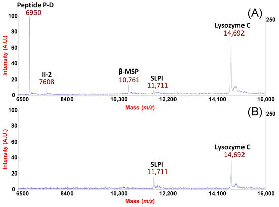 In a further example of potential applications of our platform, we also show the case of a patient suffering from AR and is topically treated for 30 days with antihistamines and corticosteroids (azelastine hydrochloride and fluticasone propionate). Figure 4 illustrates the rhinomic fingerprints obtained by our procedure before the pollen season without pharmacological treatment (Figure 4A) and after 30 days of treatment (Figure 4B). The signal loss for peptide P-D and II-2 and a decreased expression of β-MSP and Lysozyme-C are quite evident from spectra comparison (Figure 4 panel A vs. B). It is well known that Lysozyme-C is an index of serous glandular secretions [36]. In our previous work [7], we found a statistically significant increased expression of Lysozyme-C in the NF of AR patients (also in this case out of pollen season) in comparison to healthy subjects. Therefore, it can be speculated that allergic subjects may display hypertrophy or hyper-activation of the nasal submucosal glands and the use of topical corticosteroids suppress cellular infiltrates in the edematous nasal tissues [37] as well as the release of inflammatory mediators [36]. This speculation might also explain the observed decreased level of β-MSP or the lack of AMP peptide P-D and II-2.