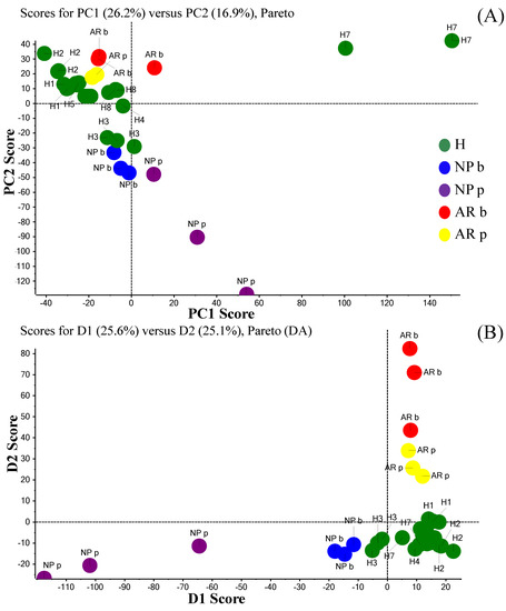 Unsupervised PCA scores plot (panel (A)) and the corresponding PCA-DA (supervised) scores plot (panel (B)) to visualize NF samples clustering. The green dots represent the NF sample obtained from eight healthy subjects (H). Red and yellow dots represent the patient with AR before and after treatment with azelastine/fluticasone (AR b and AR p respectively). Blue and violet dots represent the NARMA patient with NP before and after polypectomy (NP b and NP p, respectively). The three colored dots for each individual subject category represent the three independent intra-day replicate analyses for NF samples.