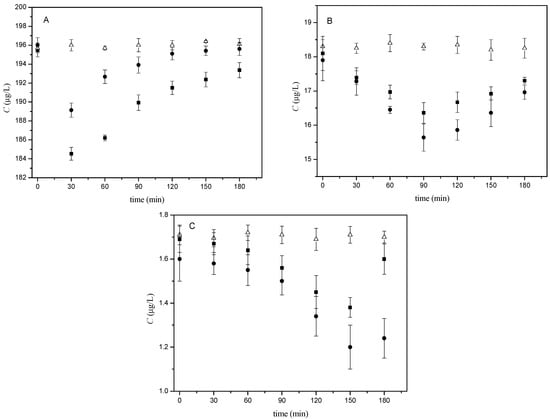 Dependencies of the concentration of total unbound estradiol on the time of mouse sperm capacitation in vitro. The tested concentrations of estradiol in M2 medium were (A) 200 μg/L, (B) 20 μg/L, and (C) 2 μg/L. Each experiment was carried out for samples with added mouse sperm (solid circles for BALB/c sperm, solid squares for C57BL/6Nvel sperm) and for reference samples without sperm (blanks, open triangles). The samples were prepared in three parallel sets, where each set represented sperm collecting from one individual; each sample was measured in five replicates; experimental conditions: 50/50 (v/v) acetonitrile (ACN)/H2O, both containing 0.1% HCOOH, measured in multiple reaction monitoring (MRM) mode for transition 255.2 to 158.9; error bars were calculated using the standard deviations (n′ = 3). For details, see Section 4.2 and Section 4.3 and Table A1 in Appendix B (Supplementary Materials).