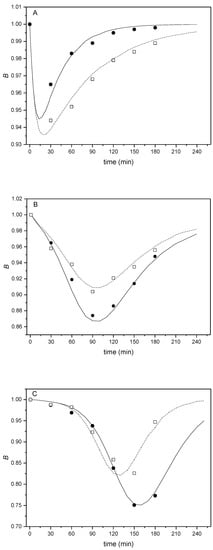 The suggested kinetic schema was described by kinetic products and rate constants in the form of rate equations. Relative values for individual variables were introduced. The system of differential equations was solved by numerical integration with the simultaneous optimization of the rate constants used to calculate the theoretical Bt values. Using MATLAB software, optimal parameters (overall rate constants K2, K3 and molar ratio n) were determined by searching the minimum of absolute values of the difference between theoretical and experimental Bt values (Table 2). These values were then used for the design of the theoretical B(t) curves. The fit of the theoretical B(t) curves and experimentally obtained data is shown in Figure 2. For a detailed description of mathematical procedure, see Appendix A (Supplementary Materials).
