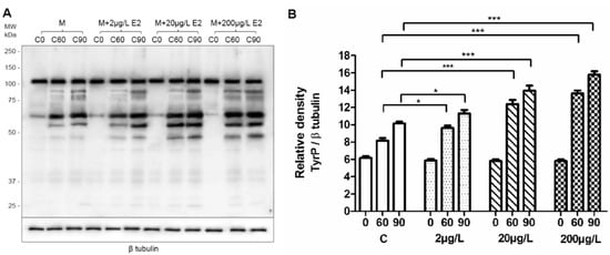 Time-dependent sperm protein TyrP in presence of estradiol (E2) under capacitating conditions as assessed by Western blot analysis and relative densitometry. (A) Control samples: sperm capacitating in commercial M2 medium (M); M + E2: the medium enriched by E2 in different concentrations (2, 20, and 200 μg/L). In contrast with freshly released epididymal sperm (t0), protein TyrP increased during sperm capacitation (t60, t90) with a maximum value at 90 min (t90). The protein TyrP was stronger when E2 was present. Increasing concentrations of E2 lead to stronger protein TyrP. β-tubulin was used as the loading control. The samples contained a protein equivalent of 106 cells. Five experiments per group were prepared; the representative results are shown. (B) Densitometry analysis of TyrP protein levels in sperm of control samples and sperm incubated in M2 medium enriched by E2. The densitometry analysis indicates relative levels of TyrP revealed a time-dependent and significant increase. Error bars indicate the SD. The statistical significance of the differences among protein TyrP abundances in different groups is indicated by asterisks (* p < 0.05, *** p ≤ 0.001).