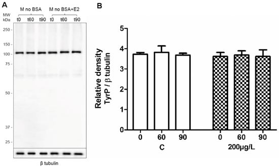 During capacitation, signalling pathways are activated resulting in protein phosphorylation, especially on tyrosine (Tyr) residues, which are the key marker of successfully ongoing capacitation process []. In order to monitor capacitation status and see whether estradiol kinetics changes under conditions that do not support capacitation, a series of experiments monitoring time-dependent (0, 60, and 90 min) sperm protein TyrP in absence (control) or presence of estradiol under capacitating (Figure 3) and non-capacitating (Figure 4) conditions were run. The presence of BSA in the medium is essential for binding cholesterol from the sperm plasma membrane, which consequently results in the signalling pathway activation and leads to the initiation of sperm capacitation. This cascade of events does not happen in the absence of BSA [,,]. We monitored the time-dependent sperm protein TyrP using Western blot (WB) protein analysis (Figure 3 and Figure 4) and immunofluorescence detection (Figure A1, Appendix B in Supplementary Materials).