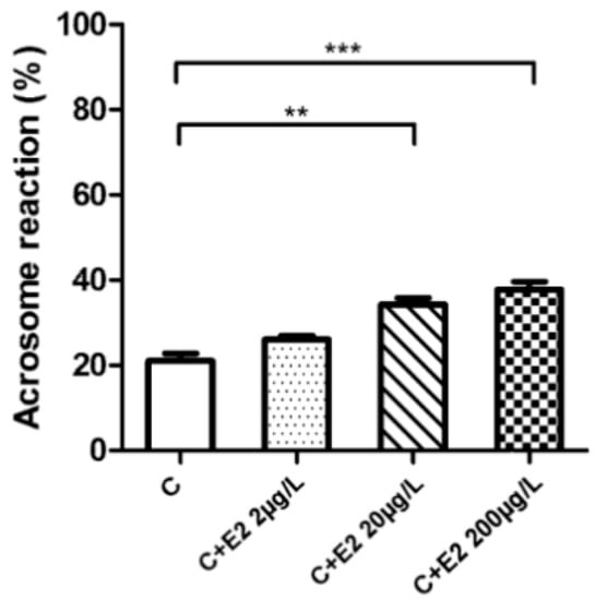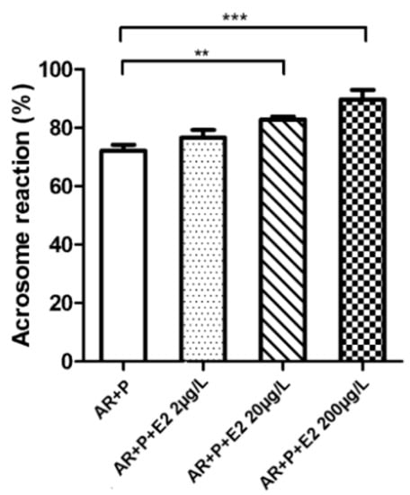 Acrosome reaction (AR) in presence of estradiol (E2) and progesterone (P). Sperm were capacitated (90 min) followed by progesterone (induced 10 μM) induced AR (90 min) in presence of E2 (AR + P + E2 2; 20 and 200 μg/L) or without E2 (control, AR + P). The results show an E2 dose-dependent increase in AR rate. A total of 200 cells were counted in six individual samples. Error bars indicate the SD. ** p < 0.01, *** p ≤ 0.001.